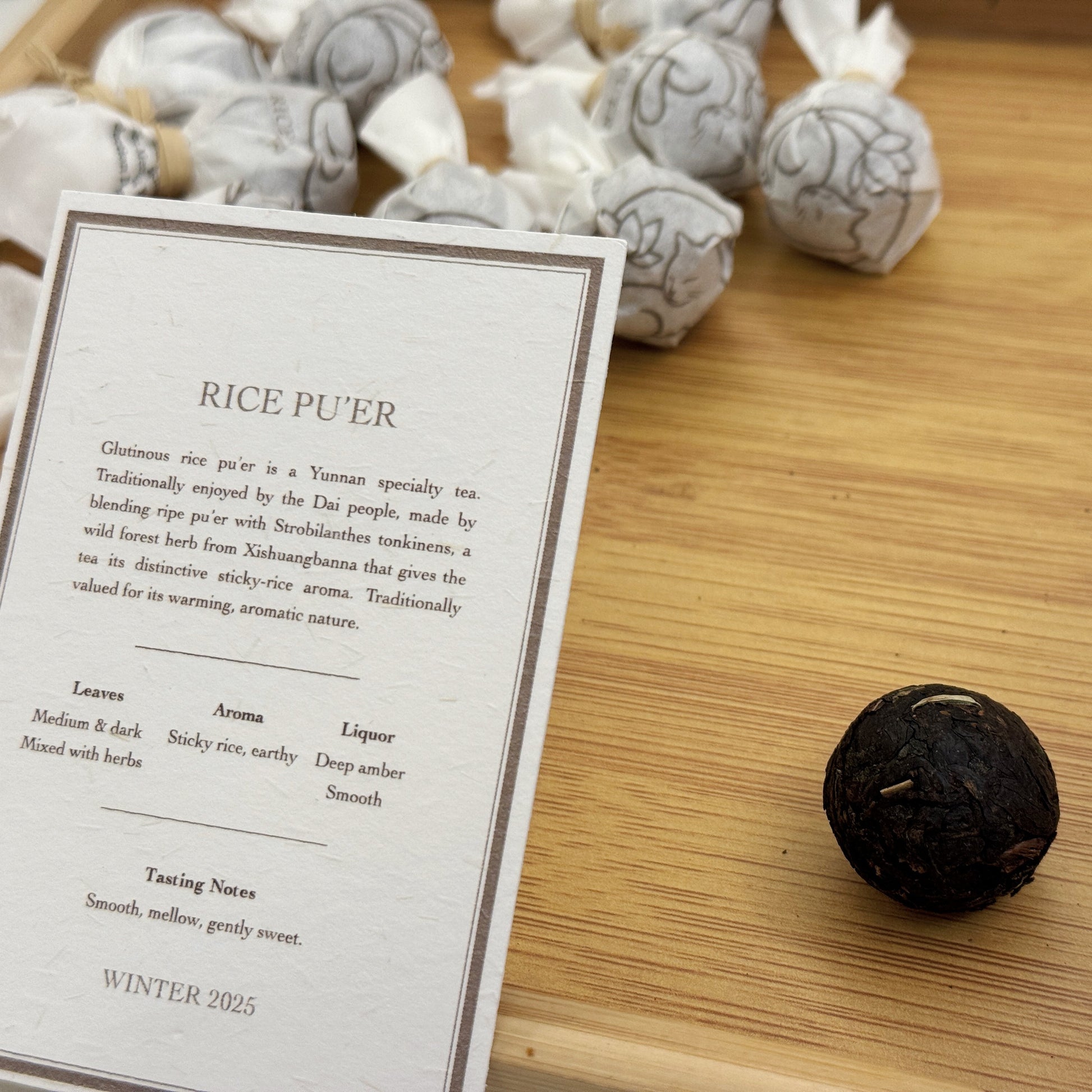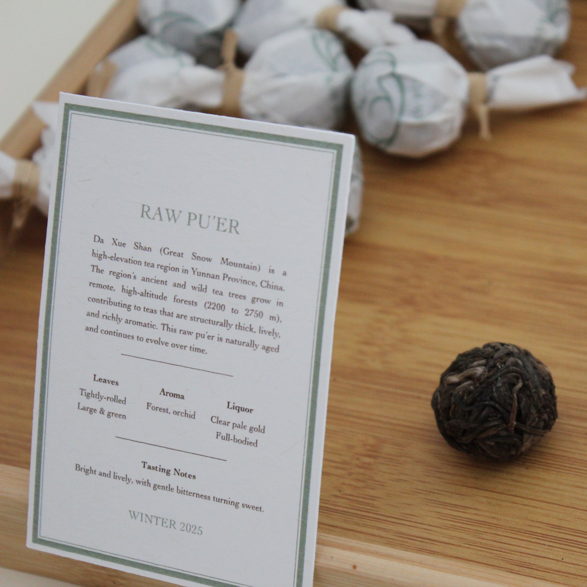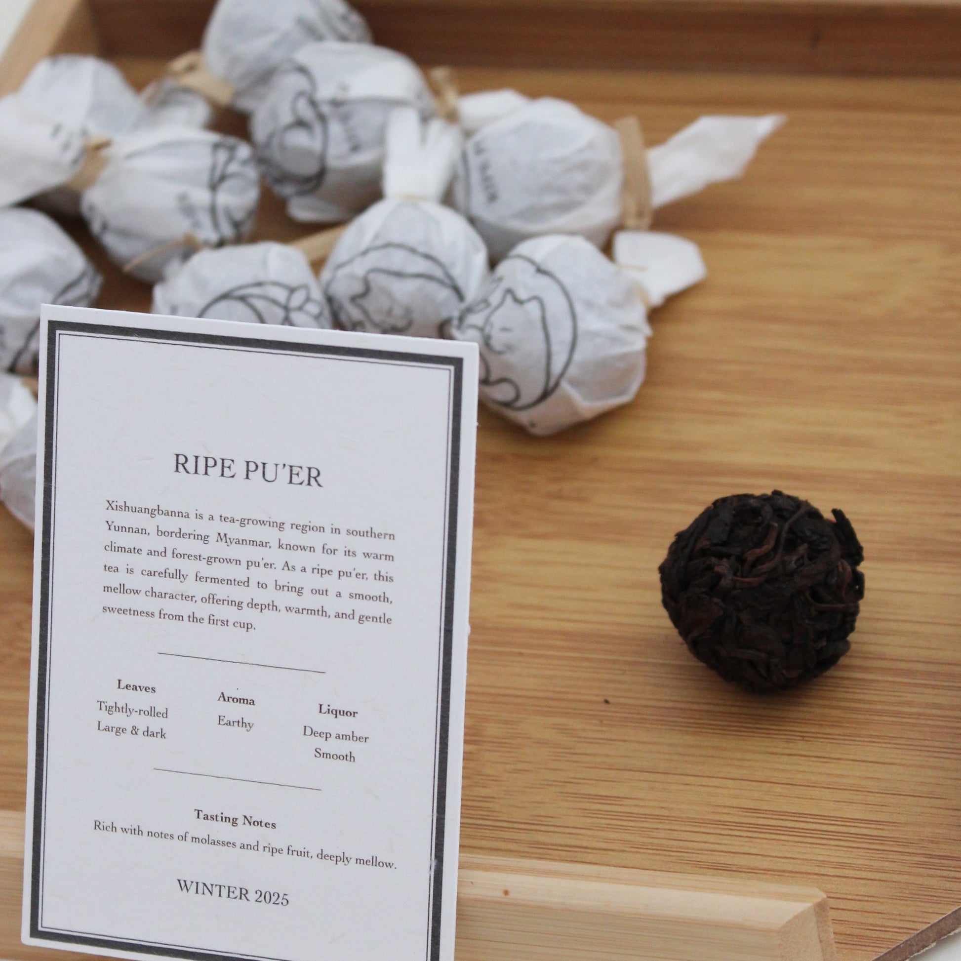 Winter '25 explores pu’er in 3 different forms, all sourced from Yunnan and hand-shaped into convenient single-serve balls. Each box contains 3 of each: